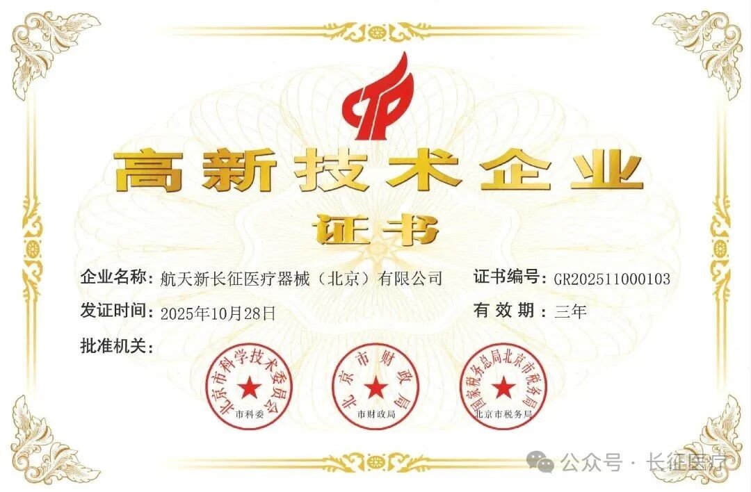 近日,全国高新技术企业认定管理工作领导小组办公室公布了2025年第一批高新技术企业备案名单,火箭院航天新长征医疗器械(北京)有限公司(简称“长征医疗”)凭借卓越的科研实力和持续的创新能力,正式通过认定。这标志着公司在技术创新、产品研发及成果转化方面获得了国家层面的权威认可,正式跻身国家重点支持的高新技术企业行列。