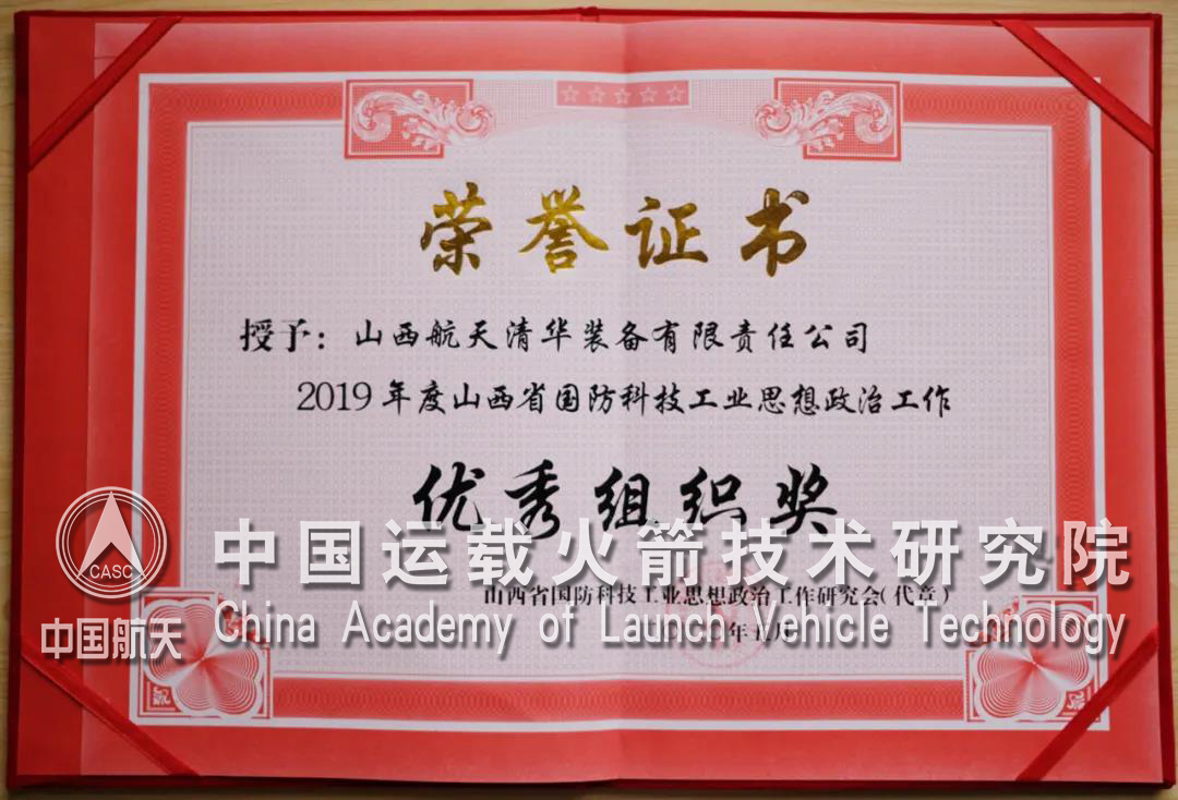 近日,中国运载火箭技术研究院山西航天清华装备有限责任公司(以下简称“清华装备公司”)获 “2019年度山西省国防科技工业思想政治工作优秀组织奖”,并且其多项政研课题获山西省国防科技工业思想政治工作研究会表彰。