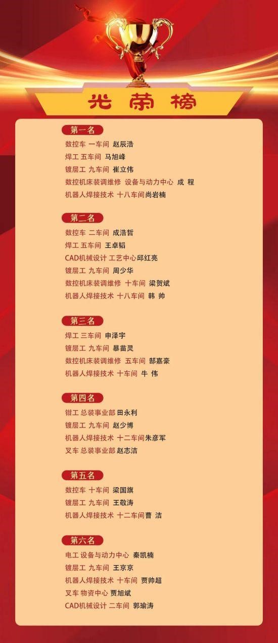 本次大赛共设数控车、焊工、钳工、机器人焊接技术、网络安全管理、CAD机械设计、电工、叉车工、镀层工、数控机床装调维修10个工种。清华装备公司选派40名优秀选手参加,最终荣获团体第一名,并夺得数控车、焊工、机器人焊接技术、镀层工、数控机床装调维修5个项目团体第一名;CAD机械设计、电工、叉车工3个项目团体第二名;网络安全管理、钳工2个项目团体第三名。此外,27名选手获得前六名,其中5人获第一名、6人获第二名、4人获第三名、12人获第4至6名。