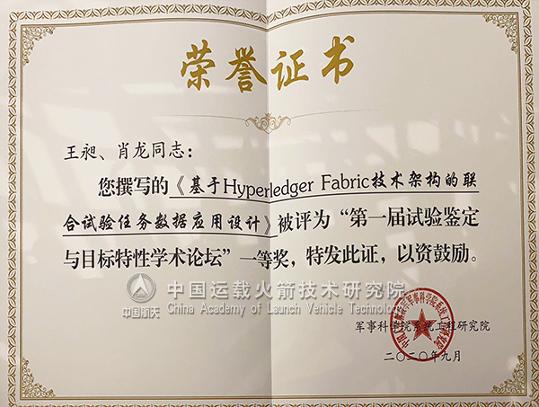 近日,由军事科学院系统工程研究院举办的首届试验鉴定与目标特性学术论坛在北京举行,中国运载火箭技术研究院北京航天自动控制研究所王昶、肖龙撰写的论文《基于Hyperledger Fabric技术架构的联合试验任务数据应用设计》被评为“第一届试验鉴定与目标特性学术论坛”一等奖。