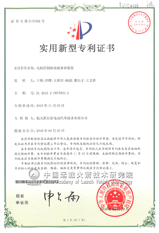 北京航天发射技术研究所所属航天新长征电动汽车技术有限公司的“电机控制器电磁兼容装置”获国家实用新型专利。