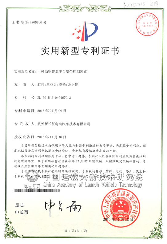北京航天发射技术研究所所属航天新长征电动汽车技术有限公司的“一种高空作业平台安全控制装置”获国家实用新型专利。