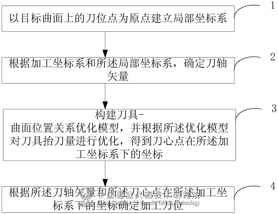 本发明解决了当前商用CAM软件无法进行四轴定轴加工刀位计算的问题,为四轴机床(尤其是不具备四轴联动补偿功能的四轴机床)的复杂曲面高效数控加工,提供了一种行之有效的解决方法。