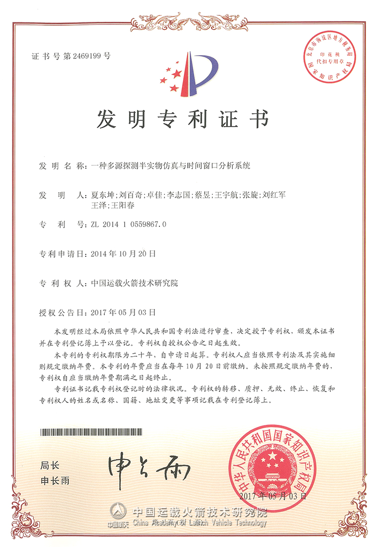 中国运载火箭技术研究院研究发展部申请的“一种多源探测半实物仿真与时间窗口分析系统”获国家发明专利。