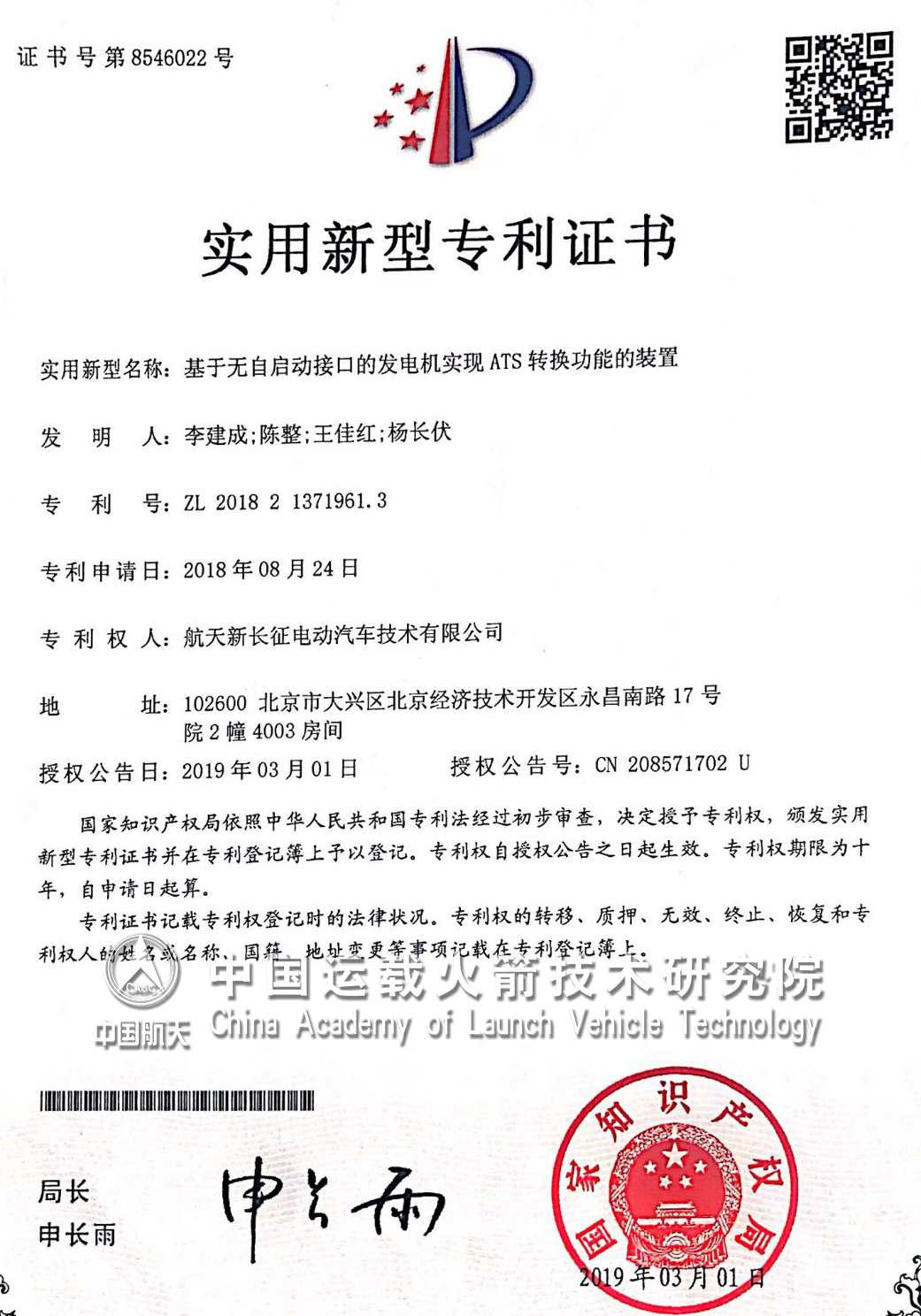 中国运载火箭技术研究院北京航天发射技术研究所所属航天新长征电动汽车技术有限公司的“基于无自启动接口的发电机实现ATS转换功能的装置”获实用新型专利。